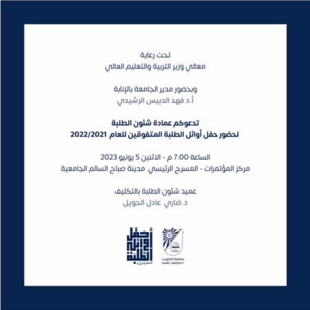 وبهذه المناسبة تقدّم القائم بأعمال عميد شئون الطلبة د.ضاري الحويل بأسمى آيات التهاني والتبريكات للطلبة لتفوقهم الدراسي خلال العام الجامعي 2022/2021، داعيًا إياهم إلى التسلح بالعلم والمعرفة لخدمة وطننا الغالي، ومشيرًا إلى أن إستراتيجية جامعة الكويت تدعم الشباب والطلبة المتفوقين من خلال تحقيق مبدأ التواجد المتميز والتعليم الجيد لطلبتها، وتشجعهم على التميّز في التحصيل العلمي، حرصًا منها على تحمل مسؤوليتها تجاه الوطن الغالي، وتأدية رسالتها كاملة لتنمية الثروة البشرية.